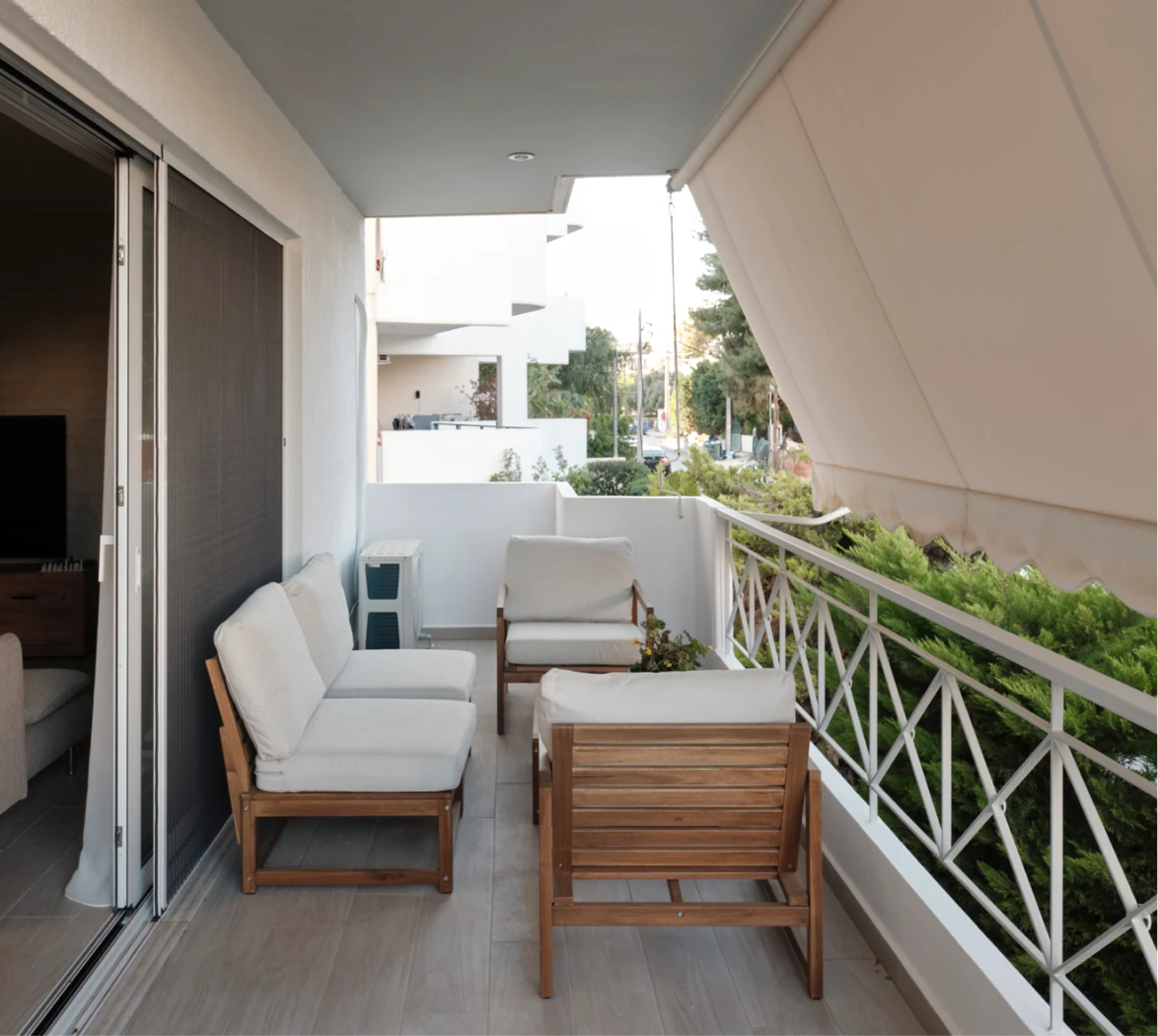Bright 2-bedroom residence in central Voula, within walking distance of the Riviera beaches. 122sq.m of renovated interiors, generous balconies, and refined minimalist design.